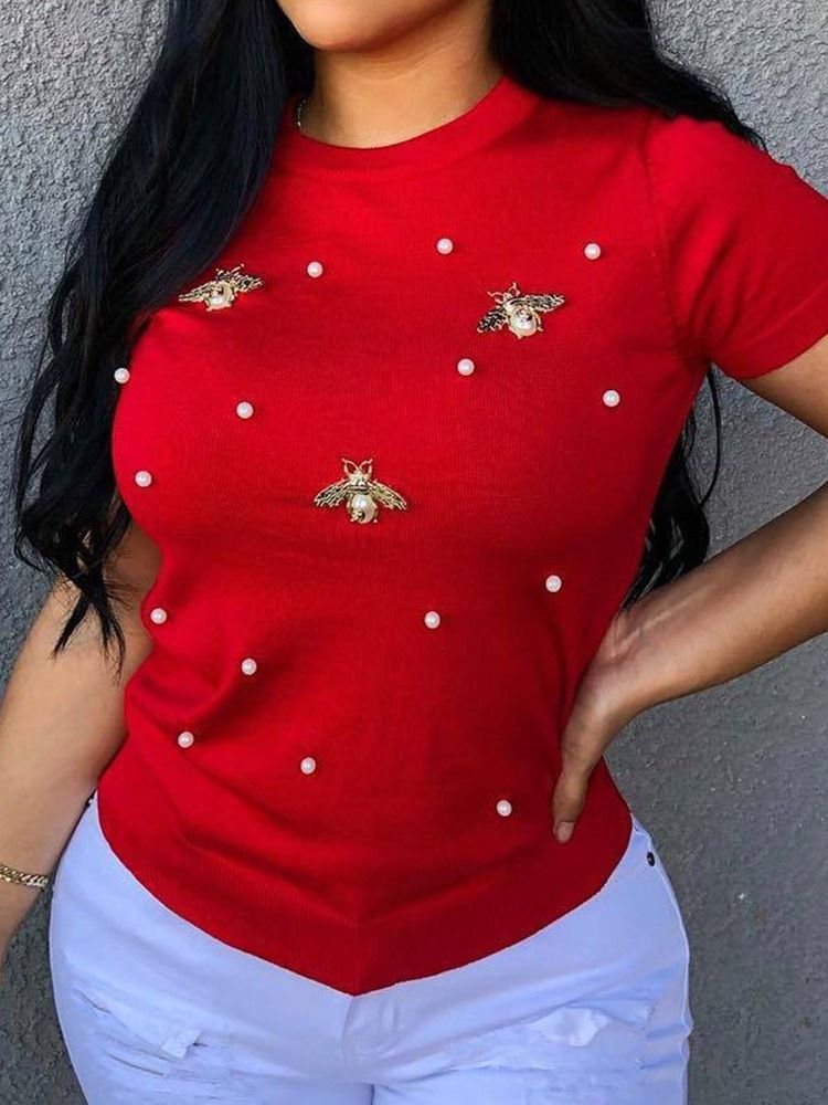 Ensfarget Kortermet Bead Casual T-Skjorte