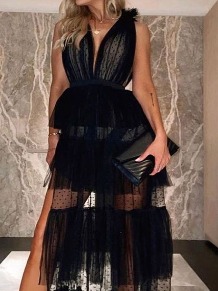 Ermeløs V-Hals Patchwork Layered Kjole Fashion Maxi Dress
