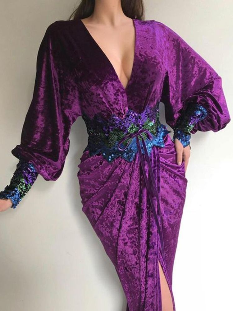 Langermet Mid-Calf V-Hals Color Block Pullover Dress