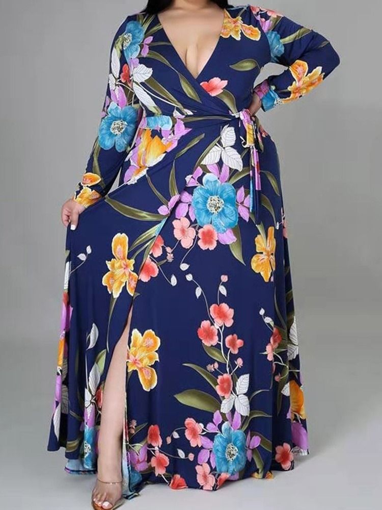 V-Hals Langermet Lace-Up Regular Expansion Maxi Kjole Plus Size